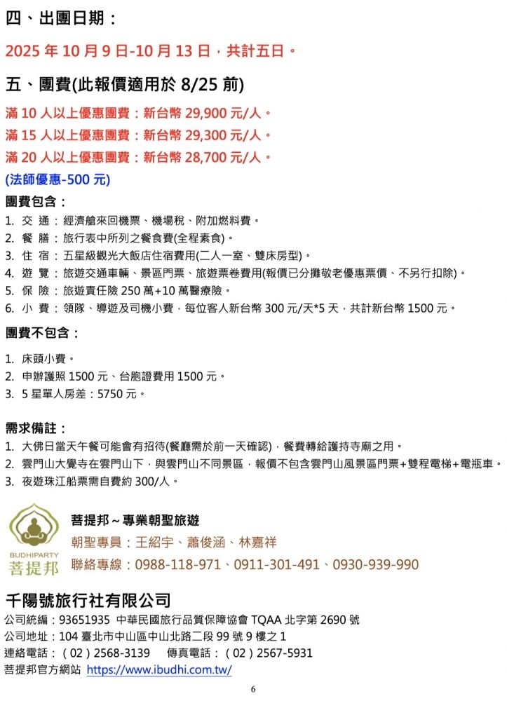 出團日期:2025/10/9(四)~10/13(一),共計5日