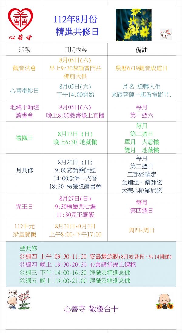 2023年8月份心善寺法會行事曆