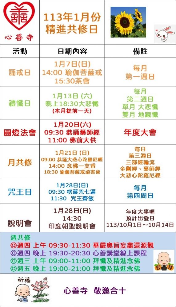 即將進入2024年的第一個月,歡迎大家回來心善寺 親近三寶 共修法會!