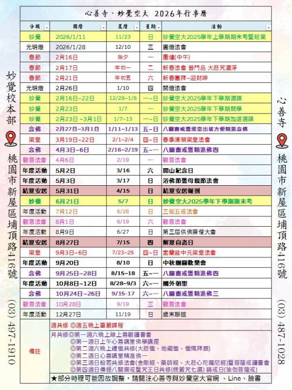 心善寺2026年年度行事曆公告