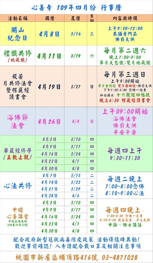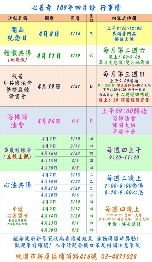 2020年四月份的行事曆出爐!另外要參加活動的佛友要注意下列公告提前報名!