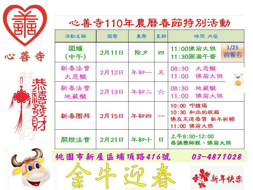 歡迎大眾及義工團隊及妙覺空大師生與有緣人, 回到心善寺參加新春法會,以下是今年農曆春節期間的法會公告!歡迎大家回到寺院裡跟住持和尚(校長)及常住還有志工信眾們一起拜年,及參加今年的團拜跟開燈法會儀式!