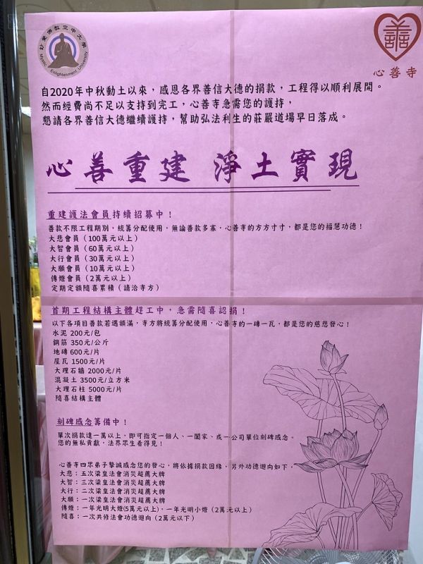 本寺目前重建工程正在如火如荼的展開,然建寺基金仍須十方大德護持,上圖為本寺最新發心項目辦法,可以選擇上述發心方式,也歡迎十方善信大德隨喜發心亦可!