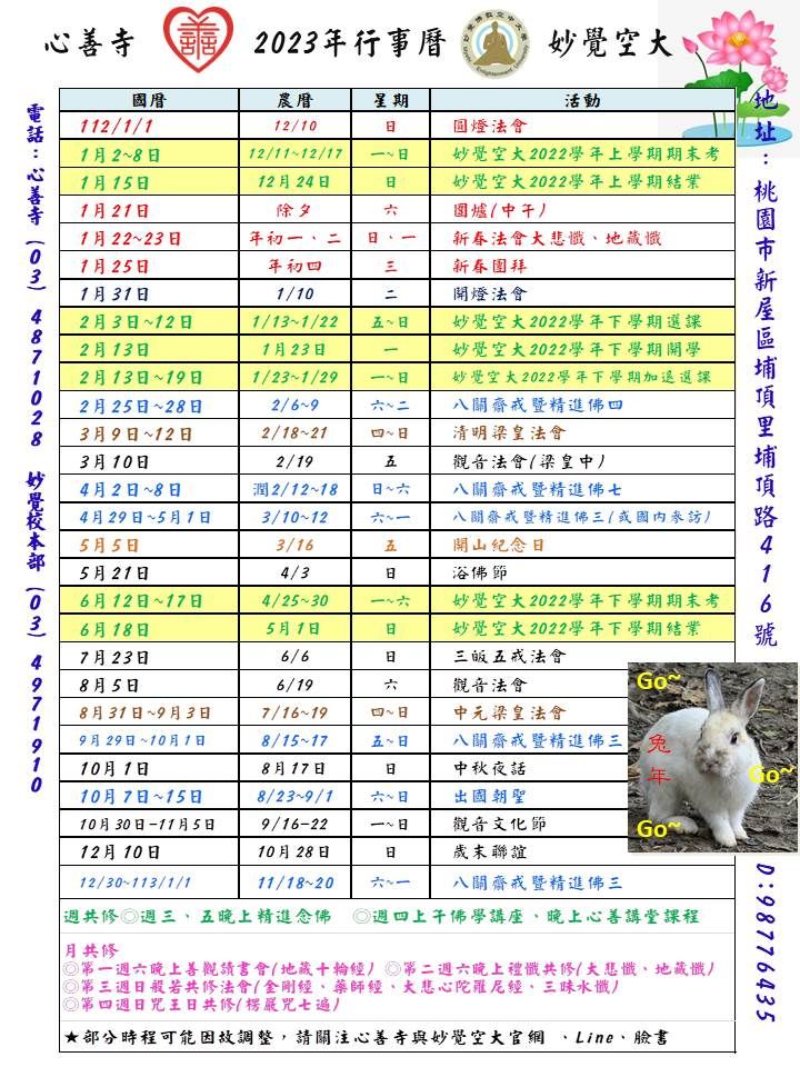 以下圖檔為心善寺2023年新的一年大略法會行程的行事曆,供作參考,歡迎十方大德善信參加法會